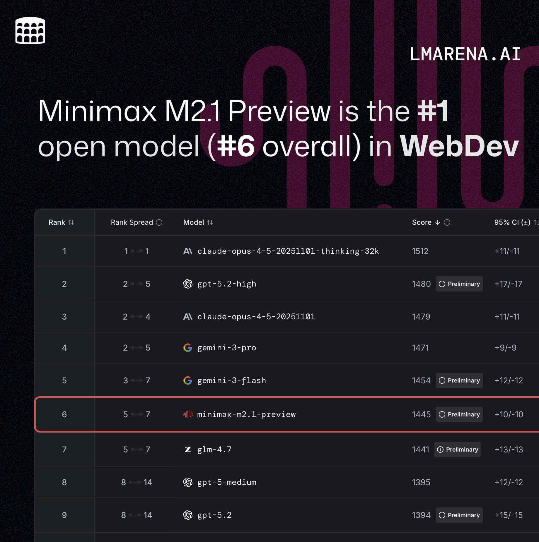 近日,在 LMARENA.AI 的 WebDev 榜单中,MiniMax M2.1 Preview 跻身全球第四名(前三名为Anthropic、OpenAI及Google)、中国第一。不仅如此,传奇程序员、Web开发框架Ruby on Rails之父DHH在X上对MiniMax M2.1给予高度评价,称其处理复杂代码库时展现出了令人印象深刻的高效能力。
