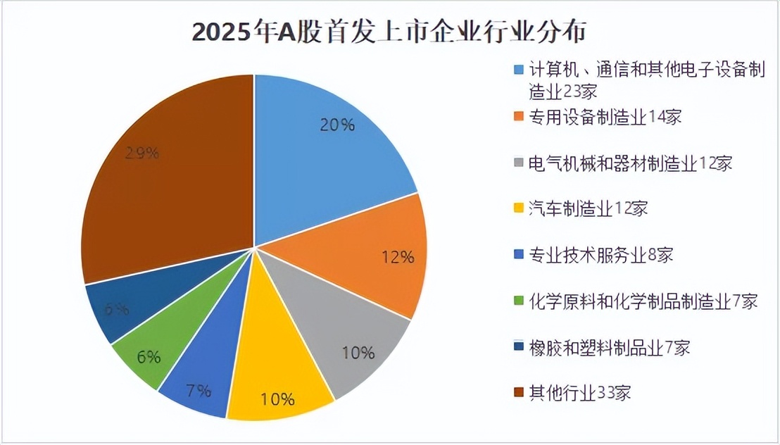 行业分布上,2025年境内IPO企业聚焦高端制造赛道,产业集聚效应十分突出。计算机、通信和其他电子设备制造业以23家的上市数量位居首位,成为资本市场的“吸金”主力;专用设备制造业紧随其后,新增14家上市企业,彰显高端装备制造领域的强劲发展动能;电气机械和器材制造业、汽车制造业并列第三,均有12家企业成功登陆资本市场,新能源与智能汽车产业链的蓬勃发展可见一斑。此外,专业技术服务业、化学原料和化学制品制造业、橡胶和塑料制品业分别贡献8家、7家、7家上市企业,高端制造与新材料领域成为资本市场关注的核心赛道。