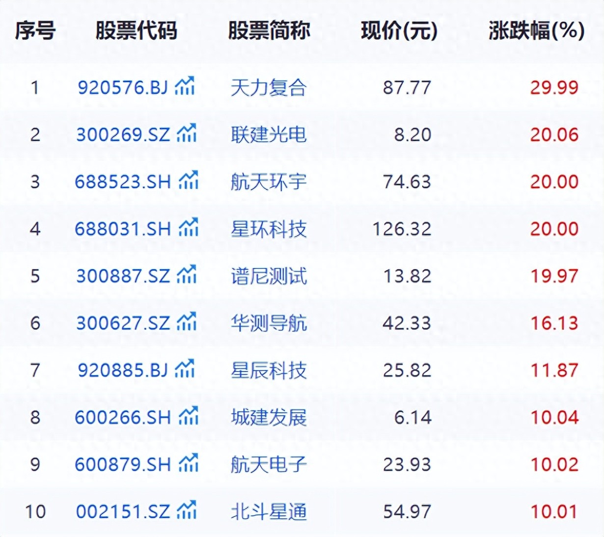 截至1月6日收盘,天力复合(920576.BJ)、联建光电(300269.SZ)、航天环宇(688523.SH)、星环科技(688031.SH)、城建发展(600266.SH)、航天电子(600879.SH)、北斗星通(002151.SZ)等20余只个股纷纷涨停。