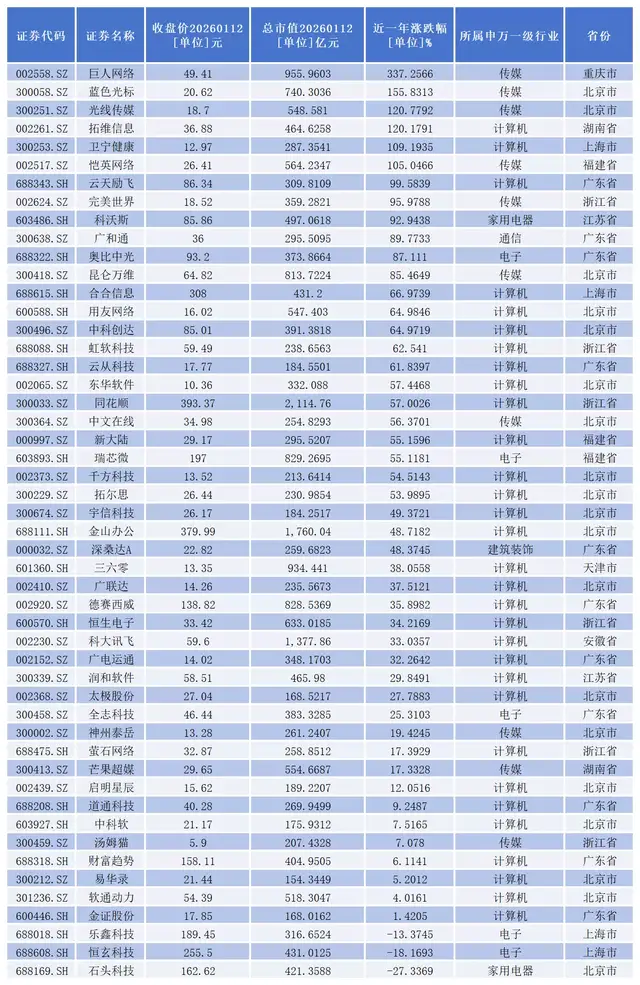 从二级市场走势看,截止1月12日收盘,近一年来,一共有47家公司股价出现上涨。其中,巨人网络、蓝色光标、光线传媒、拓维信息、卫宁健康、恺英网络6家公司股价已经实现翻倍。