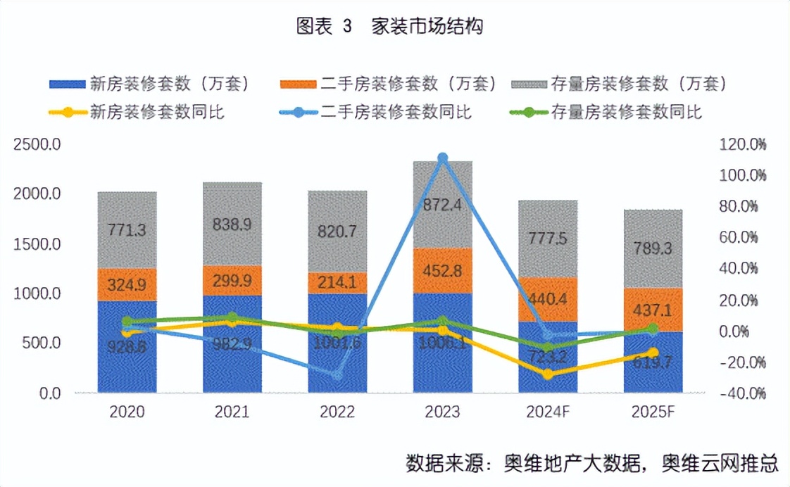 在政策指导和旧房改造需求的双轮驱动下,家装市场重心正向存量市场和旧房改造转移。奥维云网数据显示,2024年家装市场涉及的各类住宅中,新房装修723.2万套,存量房装修777.5万套,二手房装修440.4万套,意味着存量房装修套数已经超越新房,存量房流量转化成为影响家装市场未来走向的核心变量。截至2024年的存量房装修市场预计为1.5万亿元。