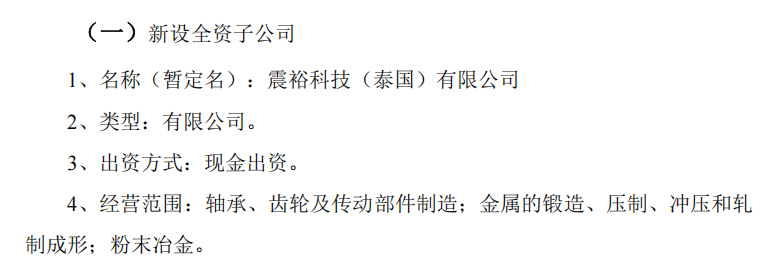 震裕科技在公告中明确指出,新设全资子公司暂定名为震裕科技(泰国)有限公司(以下简称“震裕泰国”),经营范围包括轴承、齿轮及传动部件制造;金属的锻造、压制、冲压和轧制成形;粉末冶金。