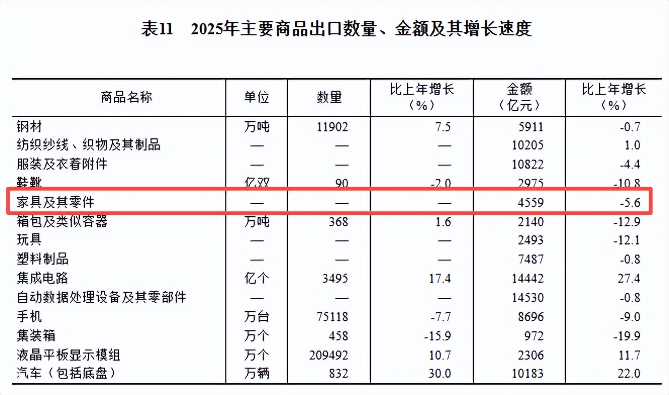 全年货物进出口上,家具及其零件出口总额4559亿元,同比上年下滑5.6%