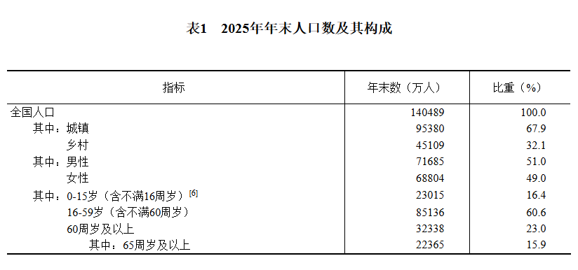 年末全国人口140489万人,比上年末减少339万人,其中城镇常住人口95380万人。全年出生人口792万人,出生率为5.63‰;死亡人口1131万人,死亡率为8.04‰;自然增长率为-2.41‰。