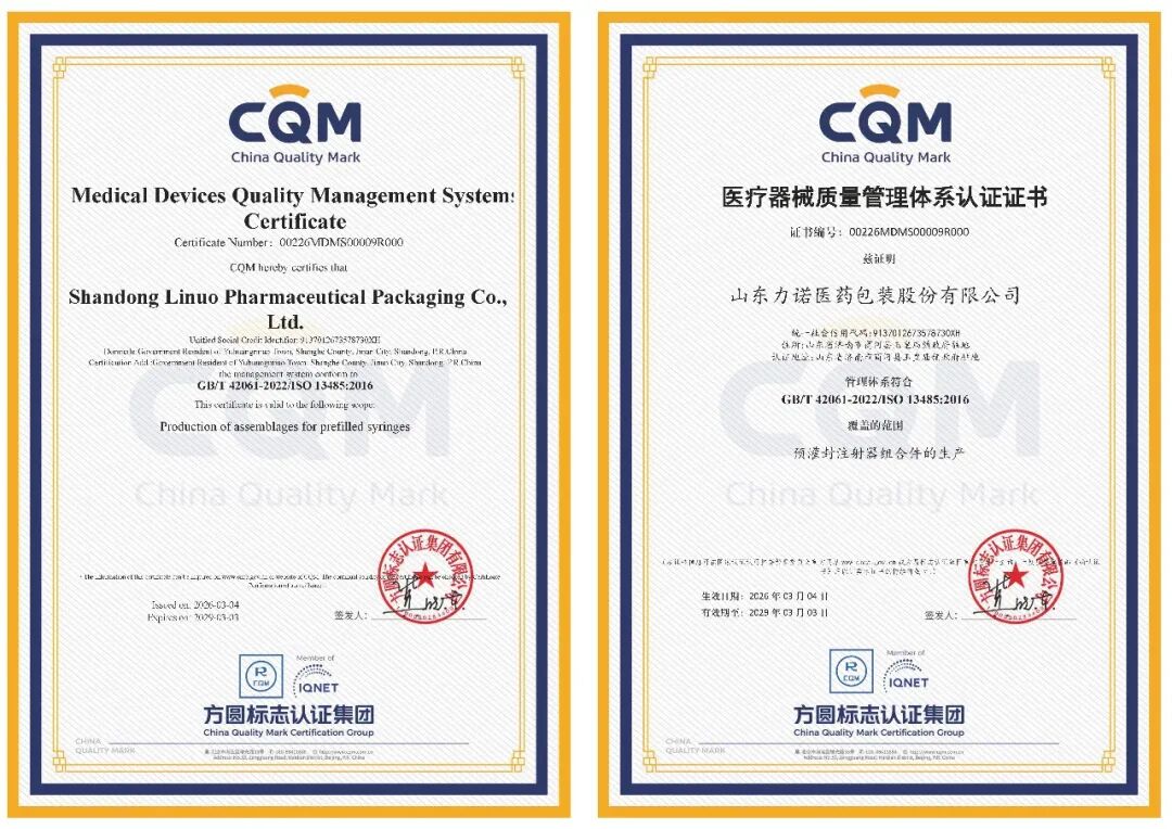 通过该认证,证实了力诺药包在中硼硅玻璃材质应用上的深厚功底,以及依托智能制造实现在硅化、清洗、灭菌等关键工序上的精准控制力,意味着力诺药包在预灌封注射器的生产上,已建立起一套“国际语言”式的质量体系,能够满足全球主要医疗器械市场监管机构的严苛要求,为公司预灌封注射器产品海外准入、全球供货打通关键路径。