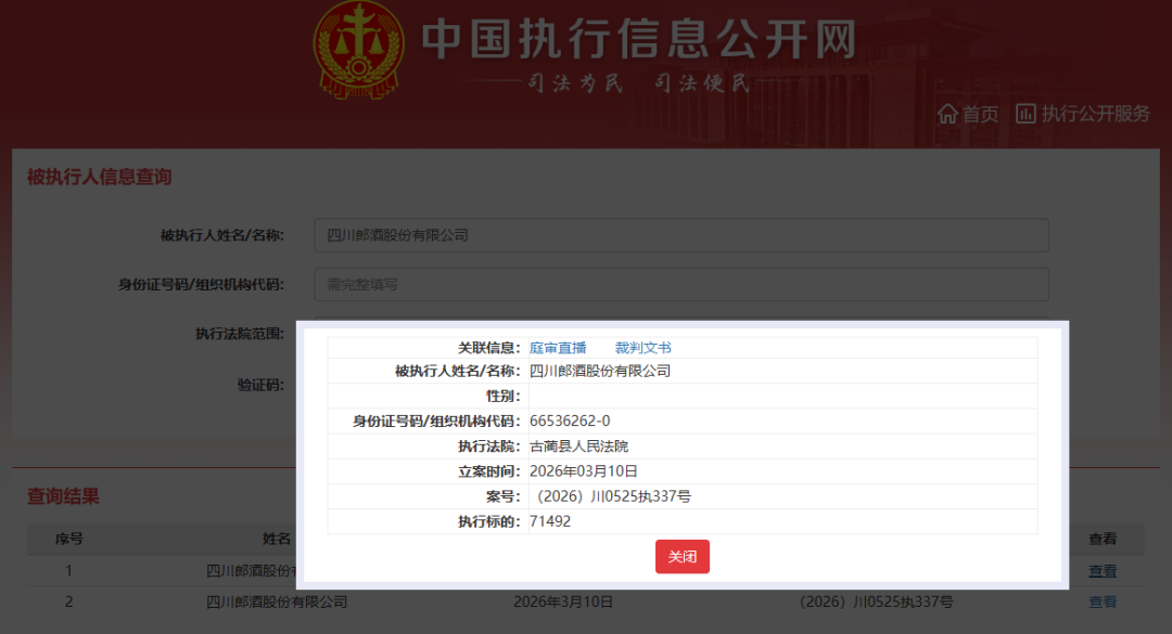 据中国执行信息公开网显示,四川郎酒股份有限公司新增一条被执行人信息,执行标的7.1万余元,执行法院为古蔺县人民法院 。