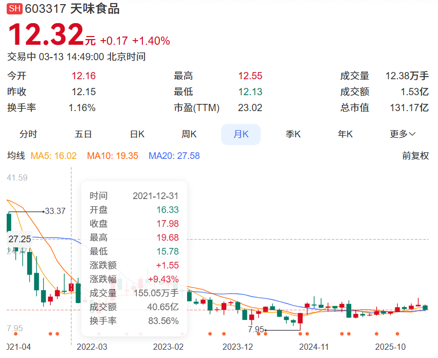 目前,天味食品总市值下降为131.17亿元(截止3月13日,14:49),较2021年高点已严重缩水。显然,市场对增长前景的担忧,终究盖过了分红的短暂利好。