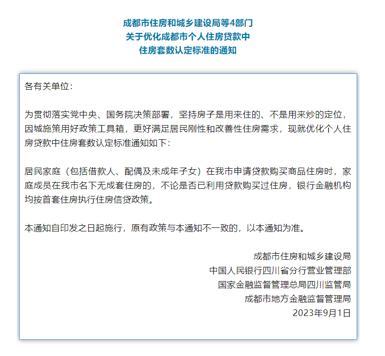 8月25日,住建部等三部委联合发文推进“认房不认贷”落地,深圳、广州、成都、武汉等多个城市就纷纷响应,宣布实施“认房不认贷”政策。8月31日,中国人民银行、国家金融监督管理总局联合发文,引导降低存量首套住房贷款利率,以及下调首付比例下限。“认房不认贷”政策叠加差别化住房信贷政策以及存量房贷利率下调等政策,将进一步激发地产市场需求,推动房地产市场平稳健康发展。