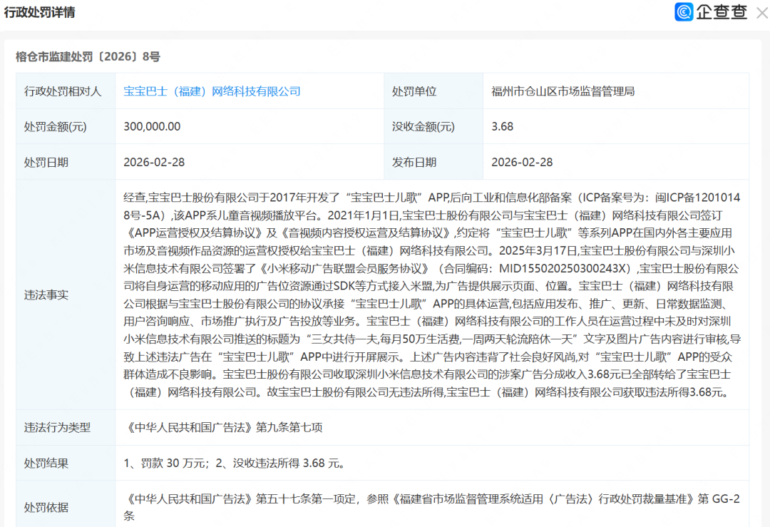 据企查查显示,近日,宝宝巴士(福建)网络科技有限公司因发布低俗广告,被福州市仓山区市场监督管理局罚款30万,没收违法所得3.68元。