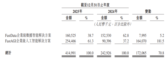 相比之下,传统FastData解决方案收入正显现出增长疲态。2023年及2024年的营收增速分别达到21.92%、24.52%,2025年该业务实现营收1.61亿元,同比仅增长5.2%。其营收占比也急剧萎缩,从2023年高达94.9%的绝对主导地位,降至2024年的62.8%,并在2025年进一步滑落至38.7%。