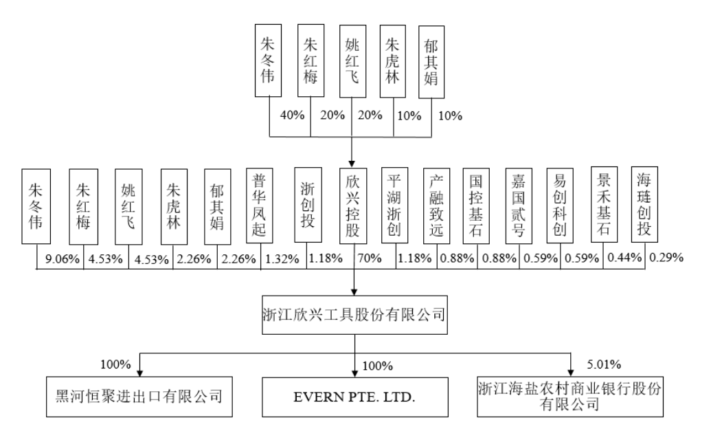 欣兴工具的创始人为朱虎林,有一儿一女,分别为朱冬伟、朱红梅,朱冬伟妻子为郁其娟,朱红梅丈夫为姚红飞。2023年提交的《招股书》显示,朱冬伟、朱红梅、姚红飞、朱虎林、郁其娟直接持有欣兴工具900万股、450万股、450万股、225万股、225万股,合计占公司总股本的30%;同时五人通过欣兴控股间接控制70%股份,达到100%控制,为共同实际控制人。