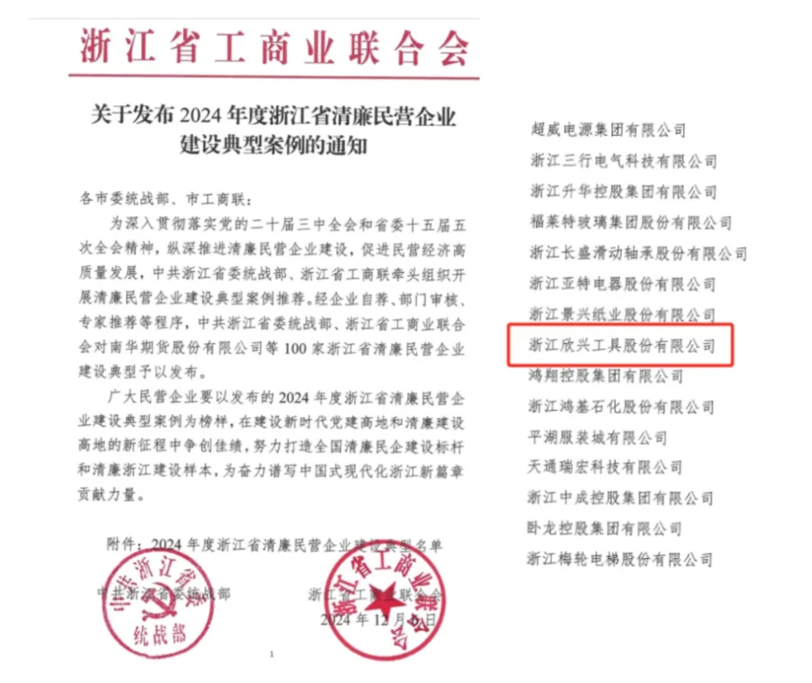 《奕泽财经》注意到,海盐统战的公众号发布的一篇文章显示,浙江欣兴工具股份有限公司入选2024年浙江省清廉民营企业建设典型案例,成为浙江省100家清廉民营企业。