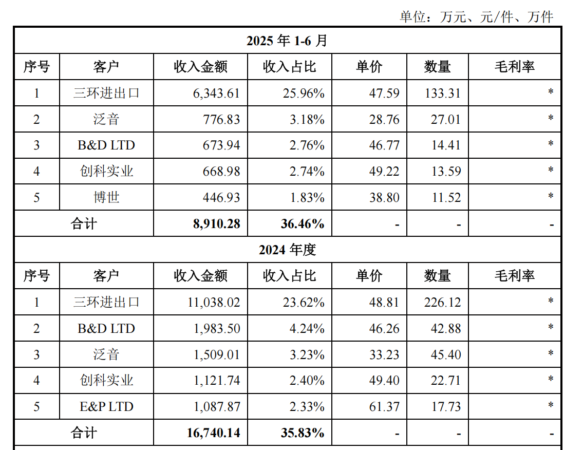 另外,《奕泽财经》还注意到,海盐三环进出口向欣兴工具采购产品的单价普遍高于其他大客户。回复文件显示,2025年上半年,海盐三环的采购单价为47元,而博世的采购单价仅有38元;2024年,海盐三环的采购单价同样高于B&D LTD以及泛音等大客户。