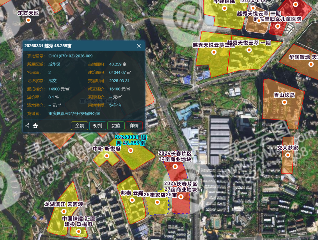 从成交结果看,地块分化明显:成华区崔家店地块溢价8.10%,被越秀以16100元/㎡竞得,显示房企对成熟区域信心稳固;而锦江、武侯、新都三宗地均底价成交,青羊地块也仅以2.60%的低溢价被金茂拿下。