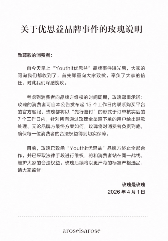 随后,李若彤直播间官微“彤享会”也发布致歉声明:即刻启动“先行售后机制”:“凡是在李若彤直播间和橱窗购买的‘优思益’产品,无论日期,无论是否开封,请联系我们,订单将于当天立刻全额退款。”