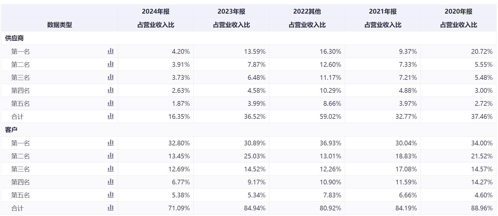招股书显示,公司前五大客户贡献收入占比长期维持在七成以上,即便2024年出现回落,依旧高达71.20%。捷捷微电、斯达半导、立昂微等少数几家行业龙头,决定了这家公司的营收命脉。
