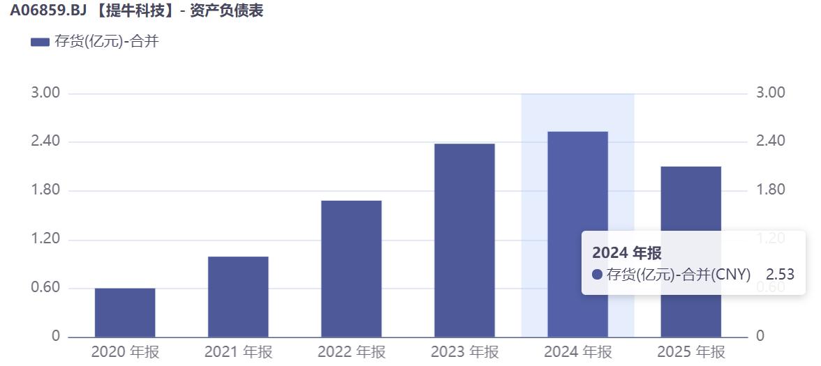 截至2024年末,提牛科技存货账面价值达到2.53亿元,占流动资产比例超过六成,存货周转率常年低于行业常规水平。大量资金沉淀在定制化设备的生产、组装与验收环节,无法形成有效现金流。