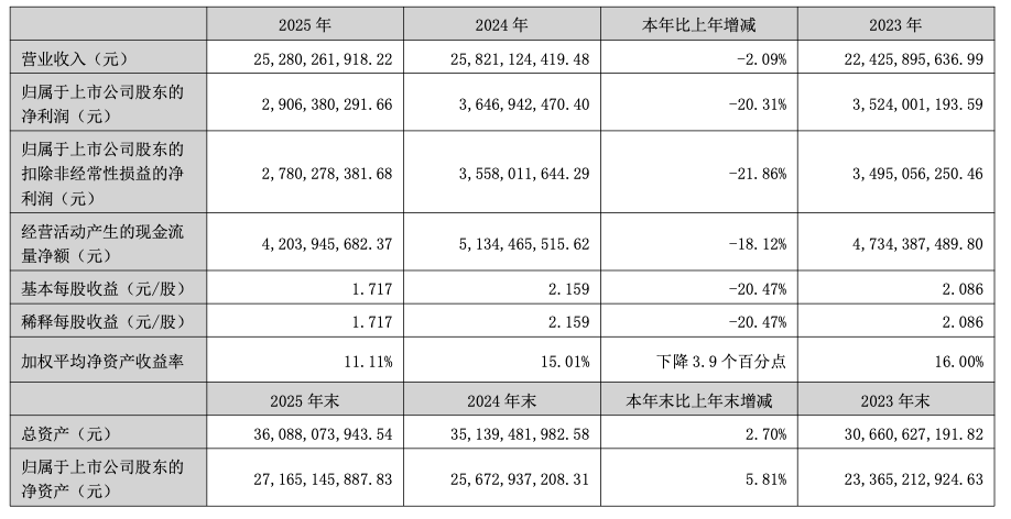 3月25日,北新集团建材股份有限公司发布2025年年度报告。报告显示,北新建材2025年实现营业收入252.80亿元,同比减少2.09%;净利润29.06亿元,同比减少20.31%,打破此前多年稳健增长态势。