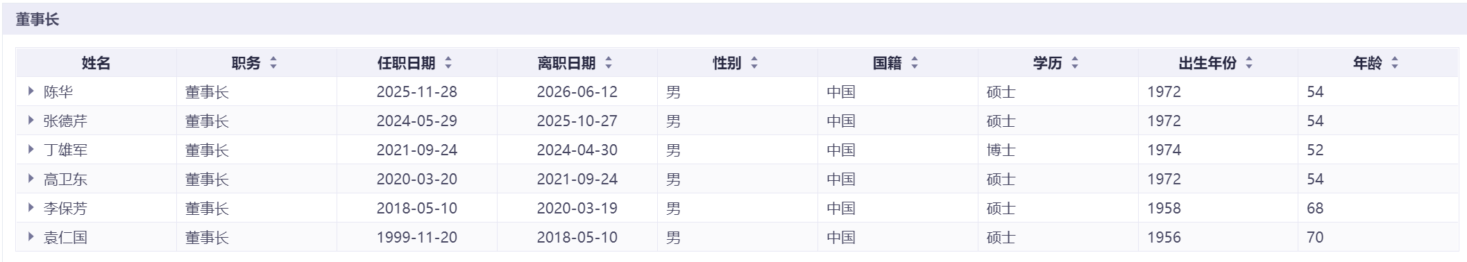 同花顺数据显示,从1999年上市至2026年的27年间,贵州茅台董事长数度更迭,分别为袁仁国、李保芳、高卫东、丁雄军、张德芹、陈华等,近6年更换5任,平均任期不足15个月。