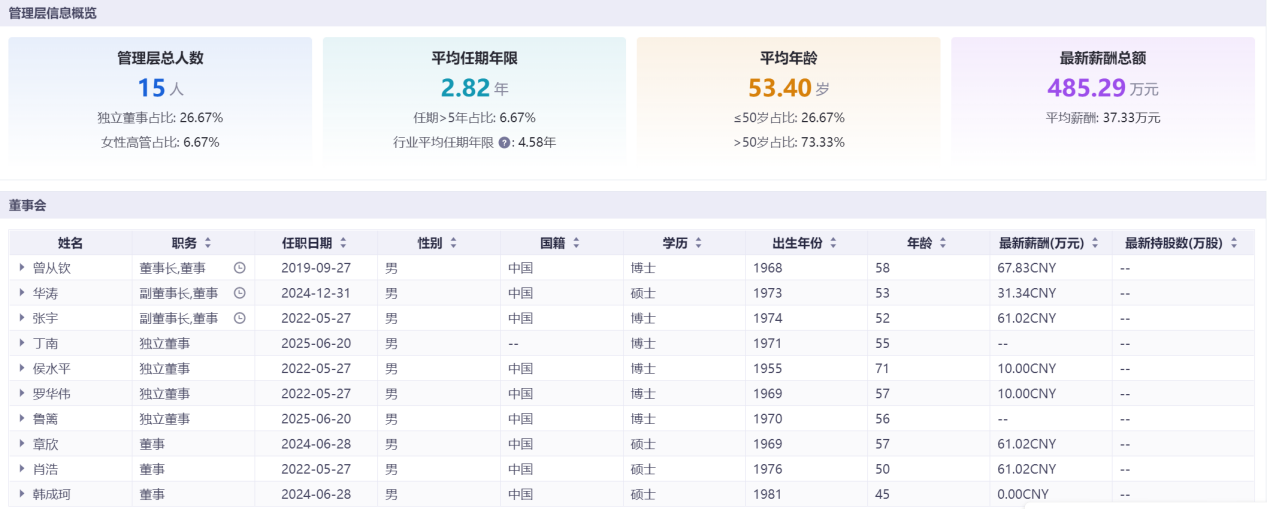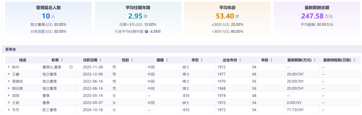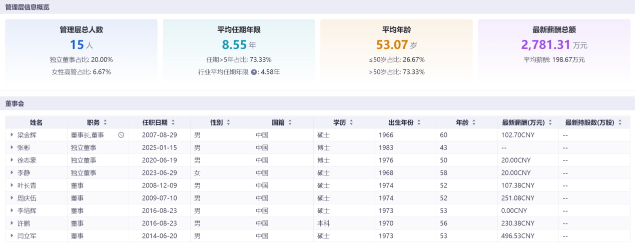 公司财务总监与董事会秘书长期稳定,董秘2009年至2026年仅更换2任,核心团队任期远超行业平均水平,管理层平均任期达8.55年,为五家企业中最高。