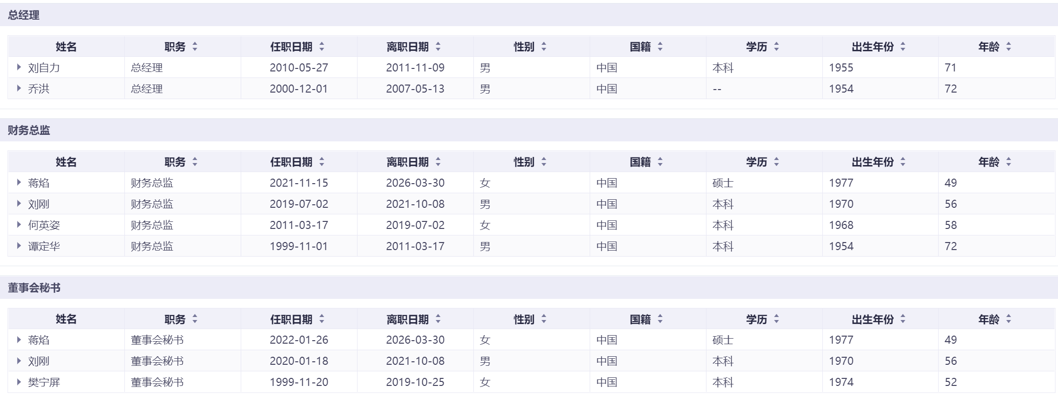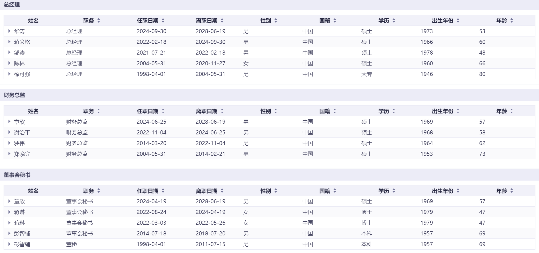 公司财务总监2004年至今更换4任,2022年至2024年两年内两度换人;董事会秘书1998年至今历经彭智辅、蒋琳、章欣3任,2022年至2024年三年两换,经营层与关键岗位短期考核特征显著。