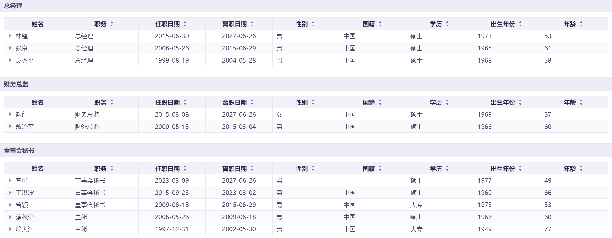 泸州老窖1999年至2026年董事长更迭3任,2015年刘淼上任至今已稳定履职近10年;总经理同期更换3任,2015年林锋上任后与董事长长期搭档。