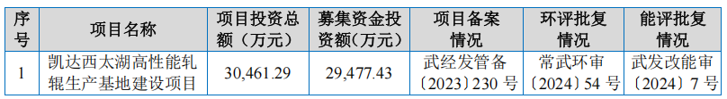 此次,凯达重工公开发行股票数量不超过6000.00万股,拟募集资金2.95亿元,基本上全部用于“凯达西太湖高性能轧辊生产基地”建设项目。