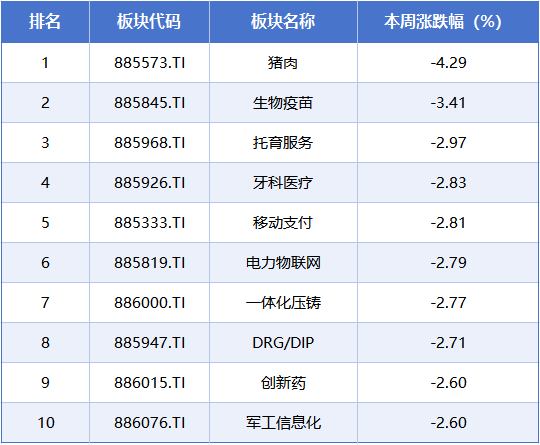 本周排在跌幅榜前排的概念板块分别是猪肉、生物疫苗、托育服务、牙科医疗、移动支付,累计跌幅分别为4.29%、3.41%、2.97%、2.83%、2.81%。