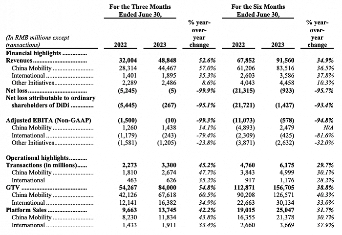 9月9日,滴滴出行在官网公布2023年第二季度业绩报告:总营收为488亿元,同比增长52.6%;归属于滴滴普通股股东的净亏损为2.67亿元,较上年同期的净亏损54.45亿元收窄95.1%;非美国通用会计准则下,经调整息税折旧及摊销前利润(EBITA)为亏损1000万元。