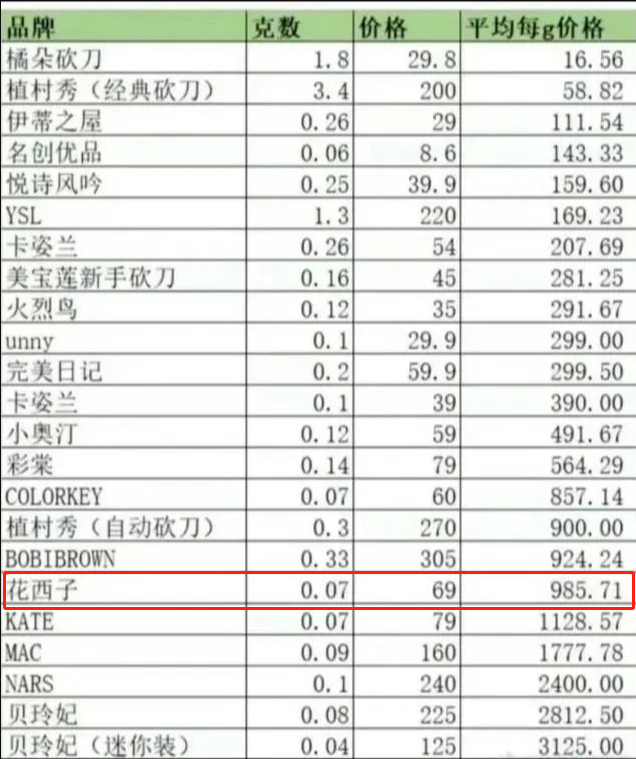 有网友表示,直播带货的花西子眉笔每克980多元,可以买两克多黄金,而花西子散粉按克计算的话,比香奈儿还贵——花西子散粉售价169元,净含量8.5克,单价19.88元每克,而香奈儿散粉售价590元,净含量30克,单价19.67元每克。
