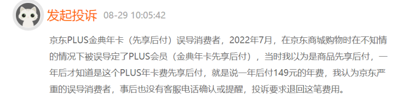 8月28日,有消费者投诉称,其于2022年7月在京东商城购物时在不知情的情况下被误导点了PLUS会员(金典年卡先享后付),当时他以为是商品先享后付,直到一年后才知道是这个PLUS年卡费先享后付,就是说一年后付149元的年费……