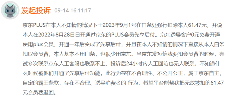 而有的消费者则连自己怎么开通了“plus先享后付”都不知道,直到被通知还款。比如,9月14日另一消费者投诉称,京东PLUS在其本人不知情的情况下于2023年9月1号在白条处强行扣除本人61.47元,声称其在2022年8月28日开通过京东的PLUS会员先享后付。