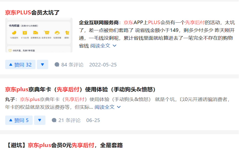 在知乎上,京东“plus先享后付”也遭到大量消费者吐槽。有消费者发贴吐槽道,京东“把0写得大大的,把流氓条款写得小小的。”