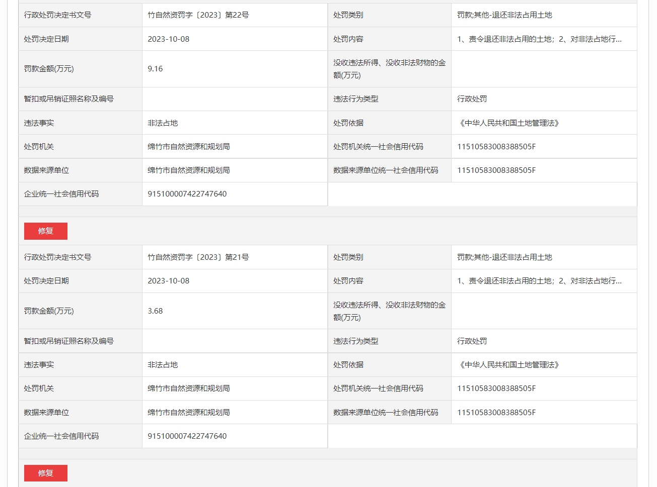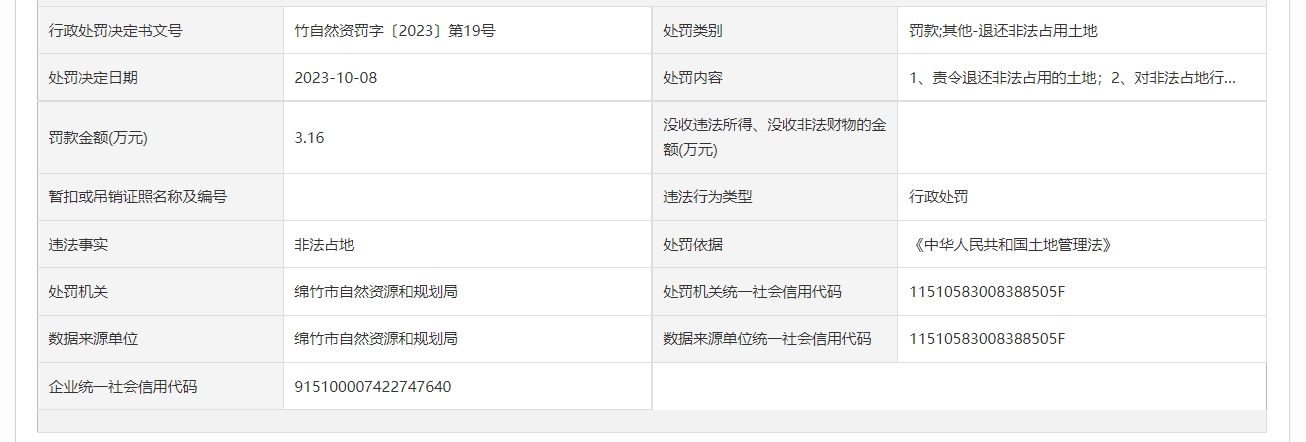 竹自然资罚字〔2023〕第19号、第20号、第21号、第22号显示,中国石油化工股份有限公司西南油气分公司因违法占地被处罚。绵竹市自然资源和规划局依据《中华人民共和国土地管理法》,责令退还非法占用的土地,并对非法占地行为分别处以3.16万元、2.26万元、3.68万元、9.16万元罚款。处罚决定日期为10月8日。