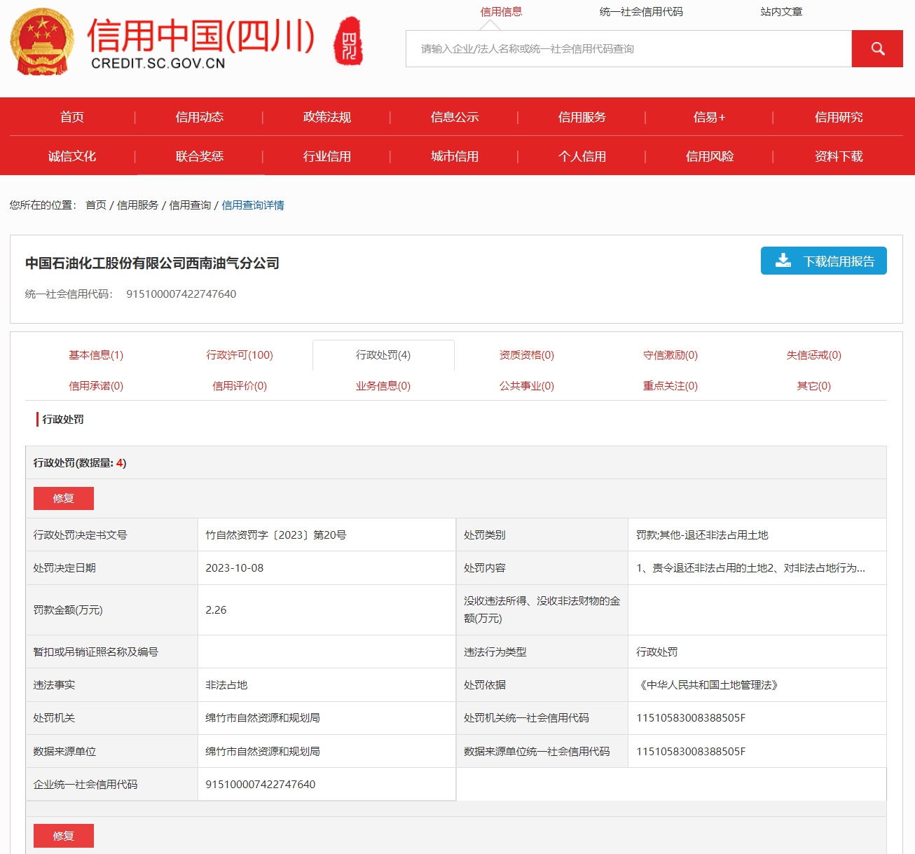 近日,信用中国(四川)网站发布的行政处罚信息显示,中国石油化工股份有限公司西南油气分公司因非法占地被连发四张罚单,罚款共计18.26万元。