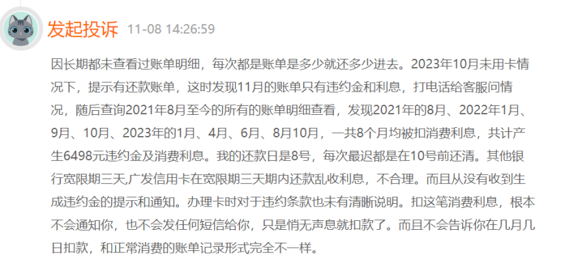11月8日,有消费者投诉称,今年10月份在未使用信用卡的情况下,广发银行提示有还款账单,且只有违约金和利息。随后该消费者查询账单明细后才发现,在2021年8月至今的所有账单中,有8个月他在宽限期内还款,但被广发银行认定为违约,共计产生6498元违约金及消费利息。