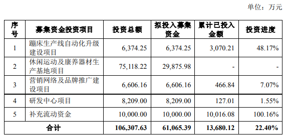 公司称,本次募投项目延期,主要是因为募投项目整体进度是根据生产销售需求逐步推进的,项目投入实施后,受宏观经济波动、市场环境变化等影响,公司根据产品的销售情况调整了蹦床生产线自动化升级建设项目的施工进度。募投项目整体建设进度有所放缓,无法在计划的时间内完成。