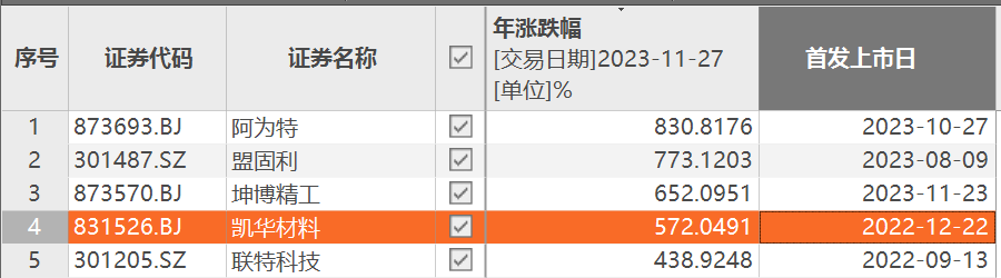凯华材料是本轮北交所个股上涨龙头,11月14日开始飙升,至27日最高点区间累计涨幅495.65%,接近500%的涨幅神话只用了10个交易日。不仅如此,如果剔除今年上市新股,该股就是今年A股名副其实的“股王”,累计涨幅572%。即使算上今年新股,该股涨幅也高居全市场第四。