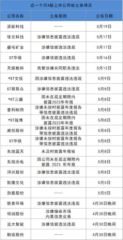 上市公司层面,据不完全统计,4月底至5月21日,5月份A股上市公司有超20家公司或高管被立案调查。从企业被立案调查的原因来看,未在规定期限内披露2023年年报及信息披露违法违规者占多数。