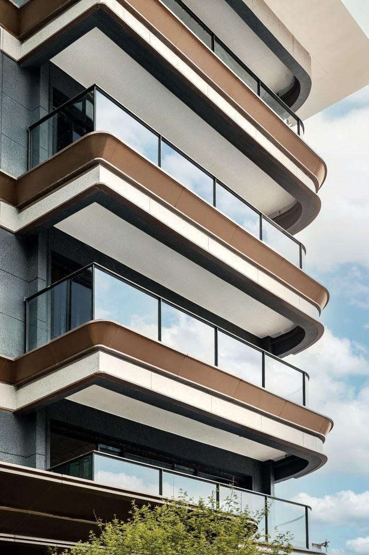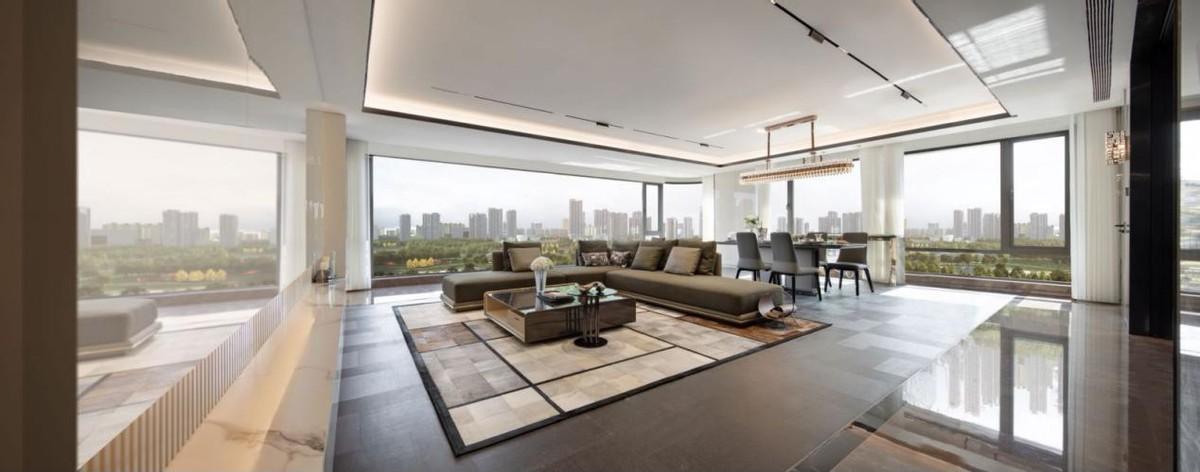 在外立面打造上,麓湖西派臻境升级了曲面+流线的设计技艺,项目以金属铝板+LOW-E玻璃+局部石材+高级灰、米白漆为主要用材,采用三段式切分,突出横向线条比例,整体营造出建筑面宽被持续放大的超大尺度感,打造超现代流线美学立面。