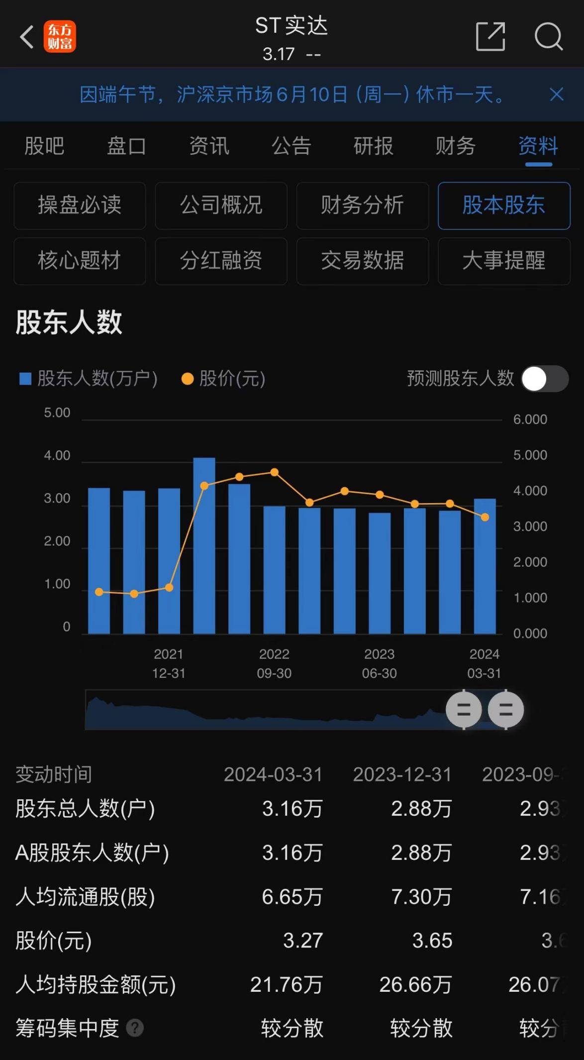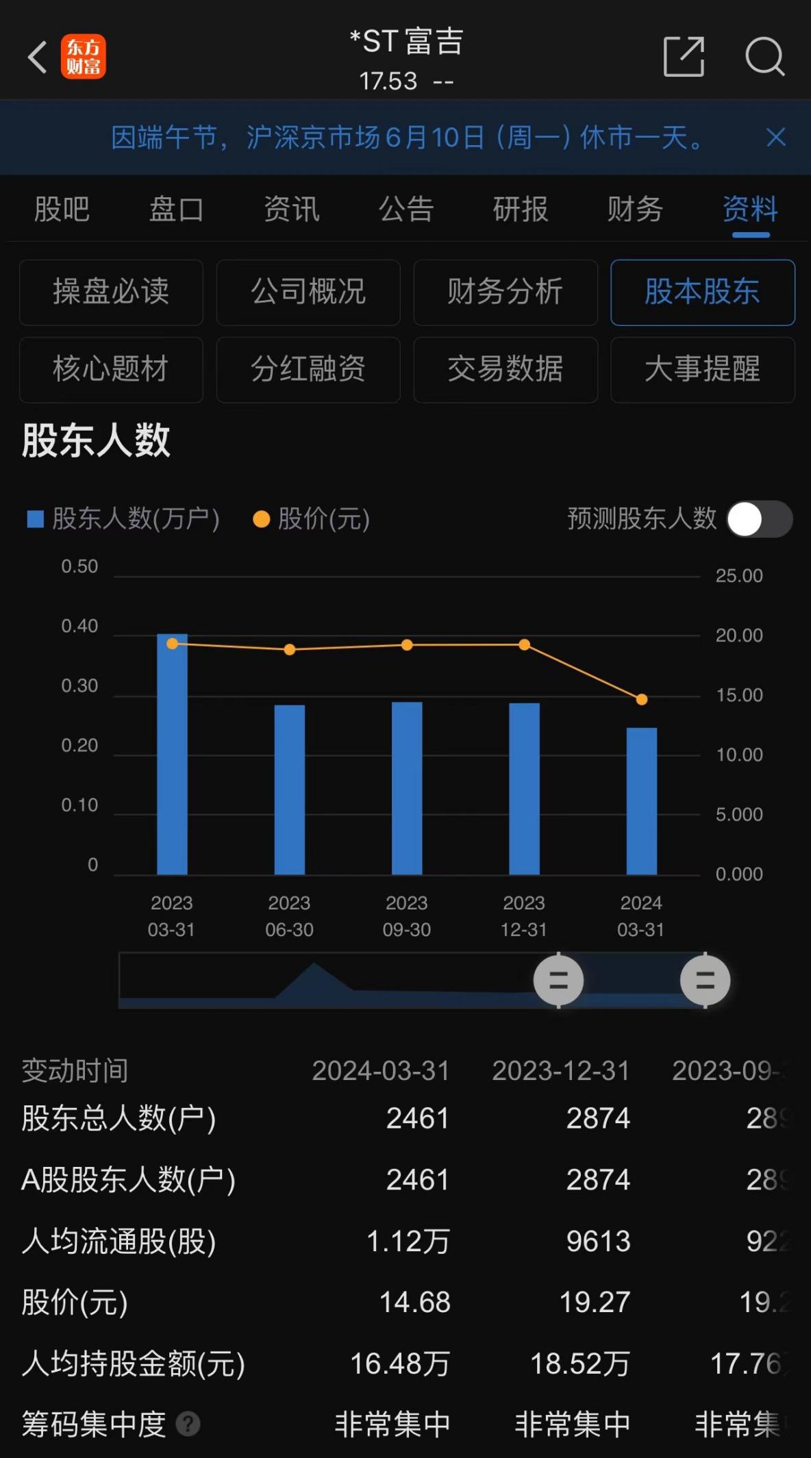 自2023年4月27日被实施退市风险警示以来,*ST富吉的股东数大幅减少,截至今年一季度末,*ST富吉仅剩2461户股东。