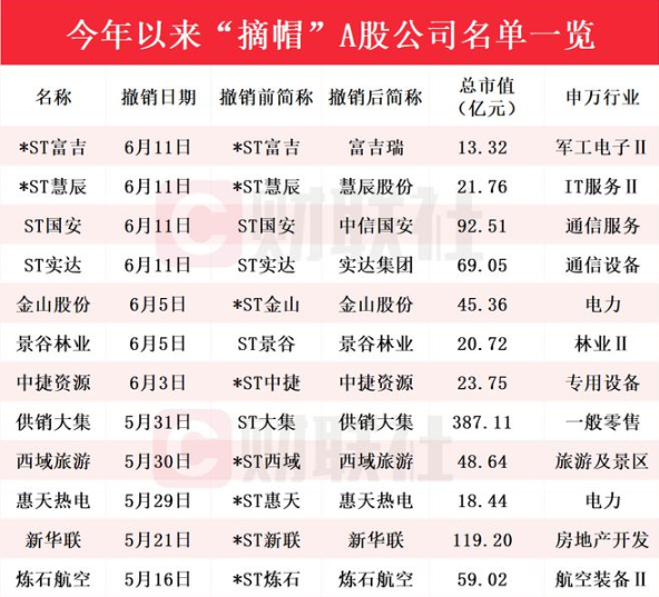 6月6日晚,*ST富吉、*ST慧辰、ST国安、ST实达4家此前被实施退市风险警示、其他风险警示的上市公司宣布“摘帽”,下周将变更股票简称。