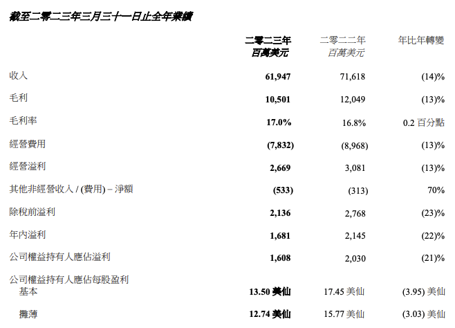 业绩报告显示,截至2023年3月31日止年度,雇员福利成本减少6.13亿美元,主要由于绩效奖金和销售佣金的减少,部分被已确认的遣散及相关费用所抵消。鉴于行业挑战,集团宣布资源配置措施并产生遣散及相关费用2.09亿美元,以进一步提高效率和竞争力。截至2022/23财年末,集团全球总人数约7.7万人。