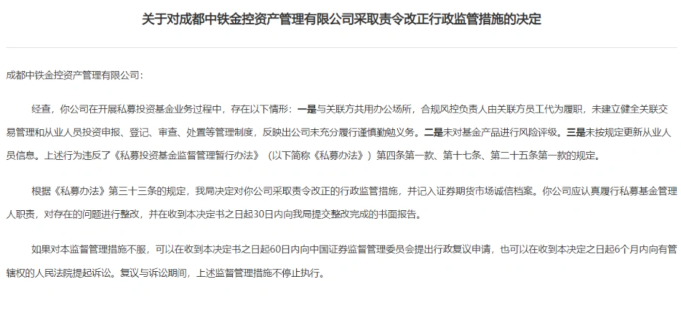 根据《私募办法》第三十三条的规定,四川证监局决定对成都中铁金控资管采取责令改正的行政监管措施,并记入证券期货市场诚信档案。