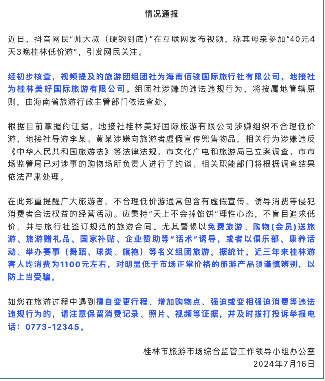 7月16日,据媒体报道,桂林市旅游市场综合监管工作领导小组办公室通报,近日,抖音网民“帅大叔(硬钢到底)”在互联网发布视频,称其母亲参加“40元4天3晚桂林低价游”,引发网民关注。