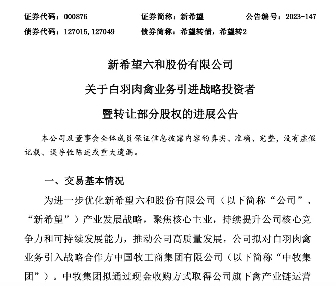 与此同时,新希望及全资子公司山东新希望六和集团有限公司(简称“山东六和”)、北京新希望拟与中国牧工商集团有限公司(简称“中牧集团”)签署《股权转让协议》,中牧集团拟通过现金方式取得新希望旗下禽产业链运营主体即山东中新食品集团有限公司(简称“中新食品”)的51%股权。其中,新希望、山东六和、北京新希望分别转让中新食品的20%股权、2%股权和29%股权。