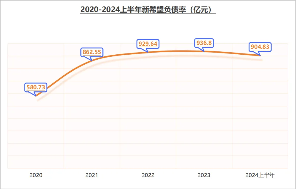 业绩下滑导致的直接问题便是债务压力的陡增。公开数据显示,2020-2023年,新希望总负债分别为580.73亿元、862.55亿元、929.64亿元和936.8亿元,2024年有所缩窄,但半年数据显示也有904.83亿,到年底这一数据还会发生变化。