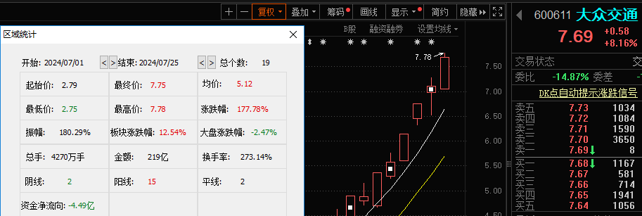 7月25日开盘后,大众交通(600611.SH)快速拉升,上午10点34分,该股成功封住涨停。7月以来,该股累计上涨超过177%。一时间,大众交通成为A股市场的“大众情人”。