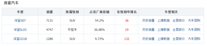 以第三方披露的8月销量数据来看,深蓝S07的月销为7131辆,占品牌当月总销量的54.2%,深蓝SL03以36.08%的份额居第二,深蓝G318的占比仅为9.73%。