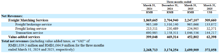细分业务板块来看,2025年Q1货运匹配服务收入为22.47亿元,较2024年同期的18.7亿元增长20.2%,主要是由于交易服务的快速增长。货运匹配业务中,货运经纪服务、货运挂牌服务、交易服务收入分别为9.66亿元、2.35亿元、10.47亿元,同比增速分别为0.05%、10%、51.5%。